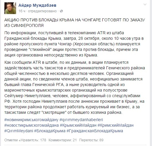 Сегодня на границе Крыма, причем с украинской стороны, пройдет акция против продовольственной блокады полуострова. Об этом сообщил пресс-секретарь акции по блокаде Айдер Муждабаев. "Планируется проведение "стихийной" акции протеста против блокады, причем эта акция организована непосредственно из Крыма. В акции планируется задействовать часть таксистов и предпринимателейГенического района общей численностью в несколько десятков человек", - написал он в Facebook. По словам Муждабаева, организатором протеста будет глава "Кырым бирлиги" Сейтумер Ниметуллаев, созданной в прошлом году на полуострове как альтернатива Меджлису, который имеет бизнес в Херсонской области.