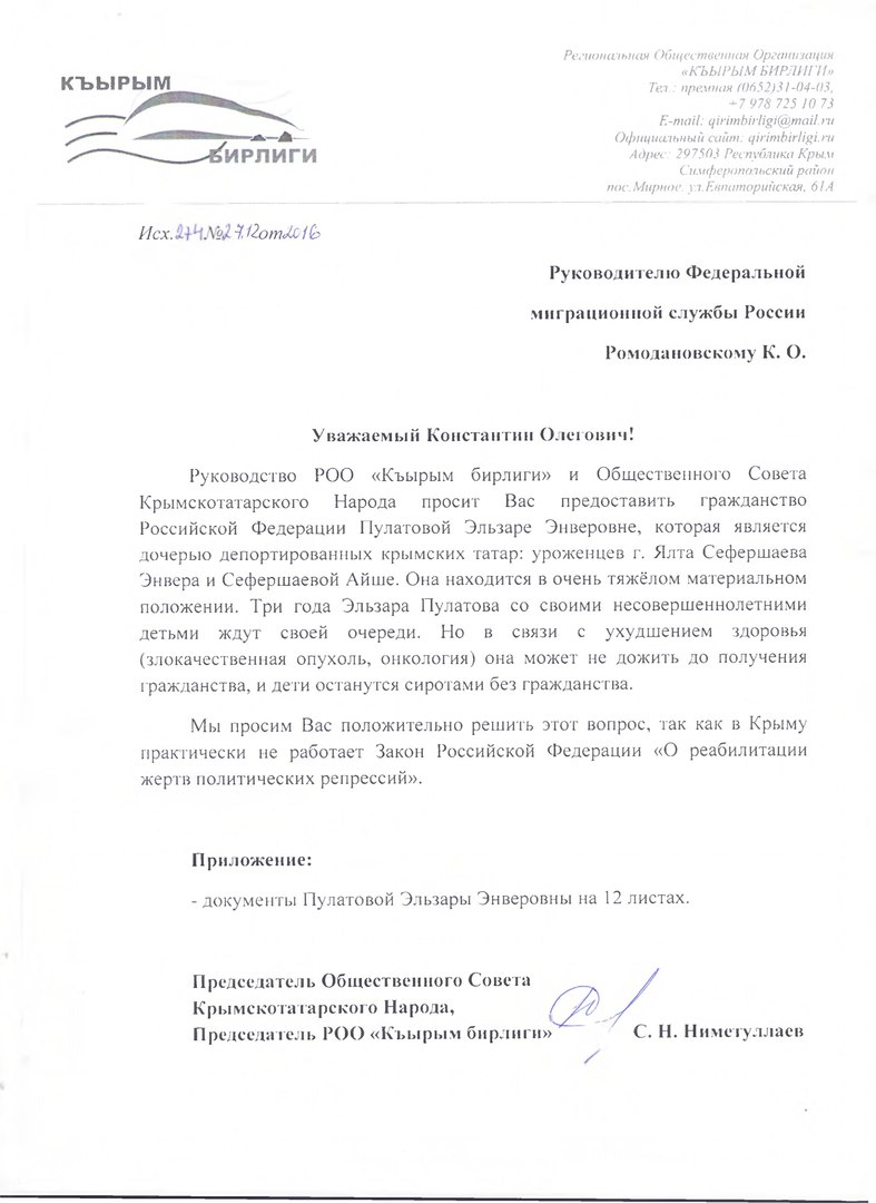 В связи с этим руководство РОО "Къырым бирлиги" и Общественного Совета Крымскотатарского Народа отправило обращение к руководителю ФМС РФ Ромодановскому Константину Олеговичу с просьбой предоставить гражданство РФ Пулатовой Эльзаре Энверовне, которая является дочерью депортированных крымских татар: уроженцев г. Ялта Сефершаева Энвера и Сефершаевой Айше.